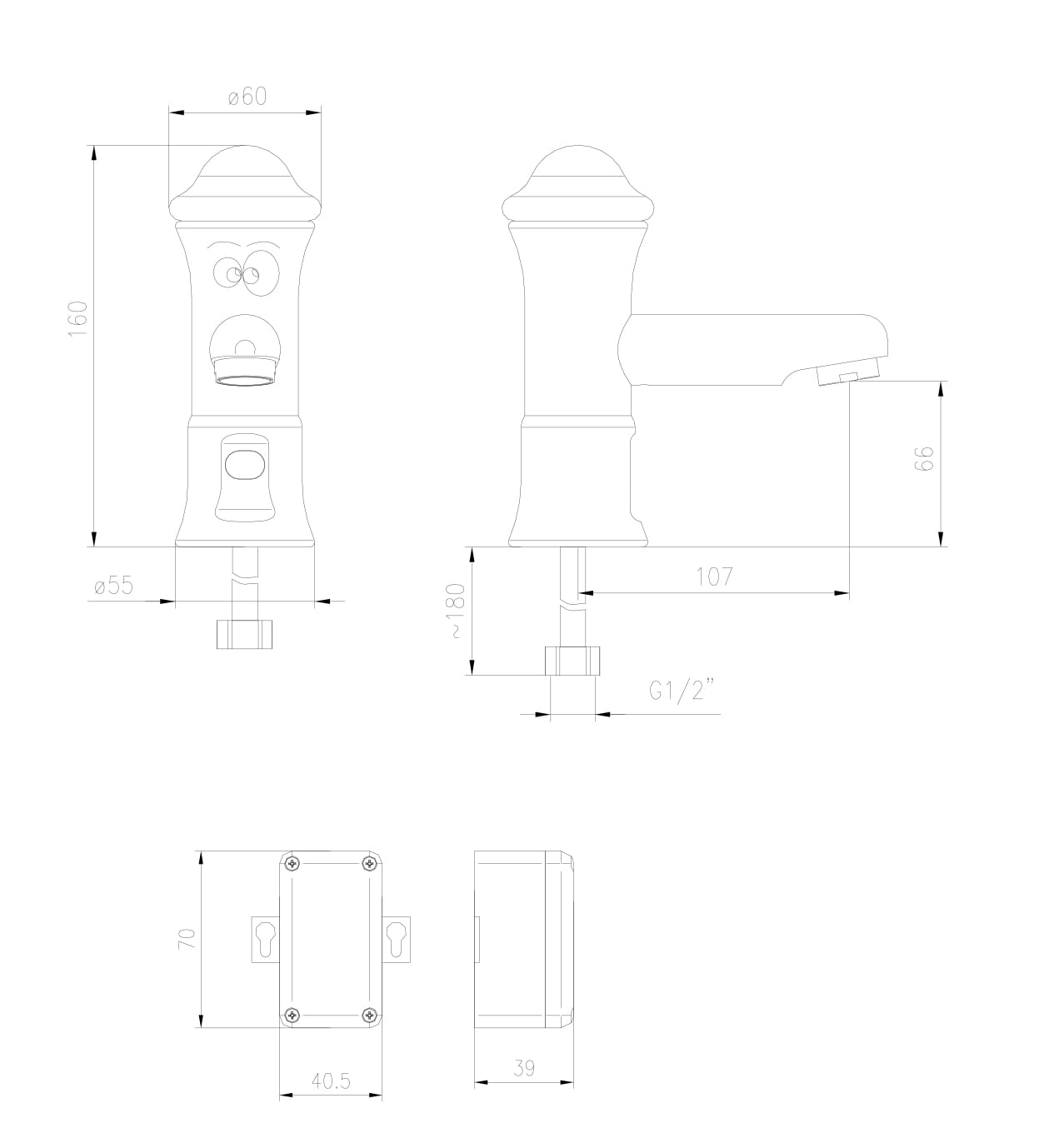 Bateria elektroniczna na wodę zmieszaną. Stworzona z myślą o najmłodszych użytkownikach. Idealna jako wyposażenie toalety w szkołach, przedszkolach i szpitalach dziecięcych.