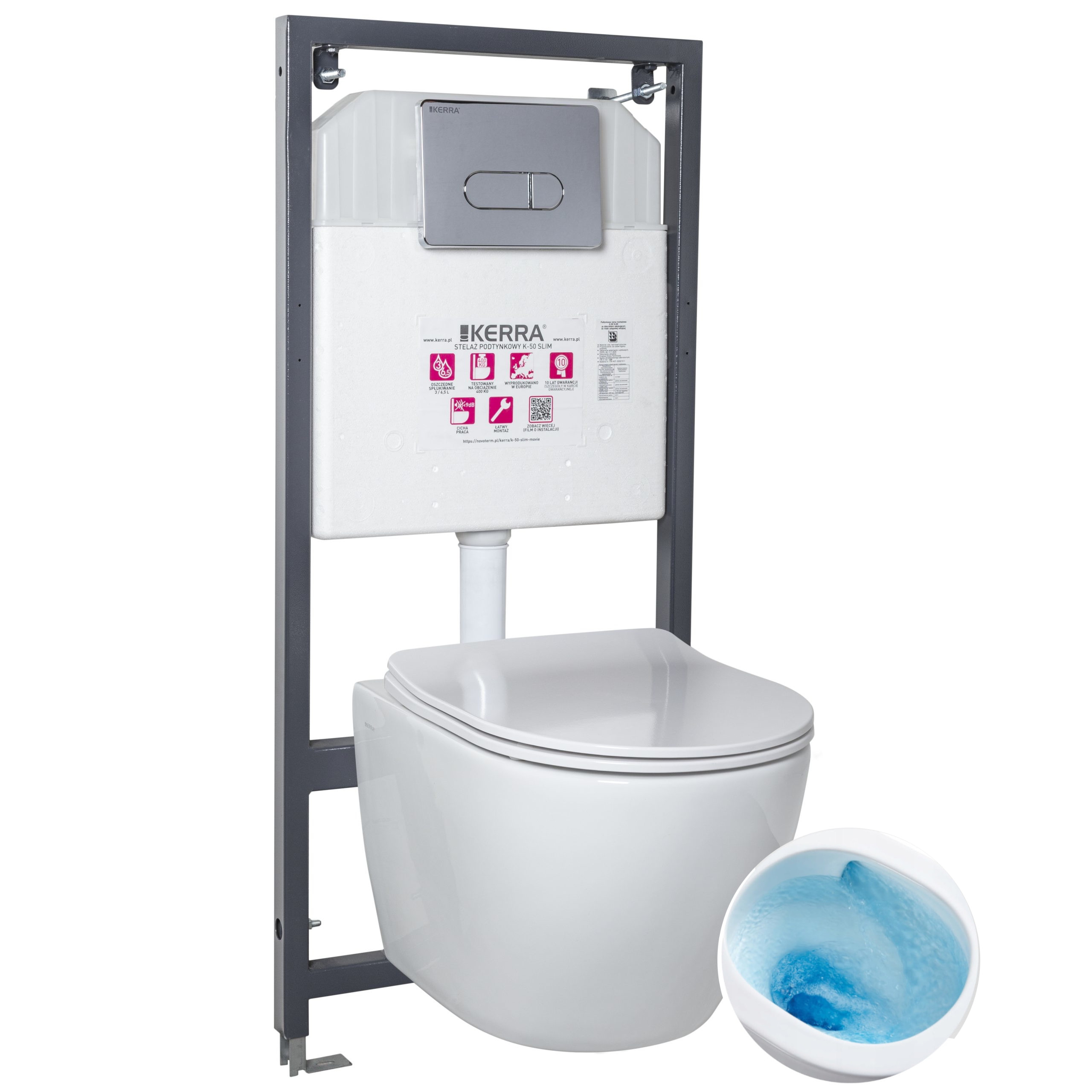 ZESTAW : stelaż+ przycisk chrom + miska WC 48,5x37x36,5 cm z wirowym systemem spłukiwania z deską , biała KASOS