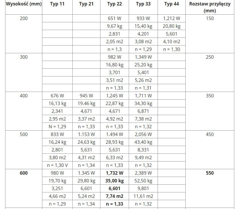Podstawowe parametry dla 1 m długości grzejnika przy warunkach 75/65/20OC W = moc, kg = waga, l = pojemność, m2 = powierzchnia
