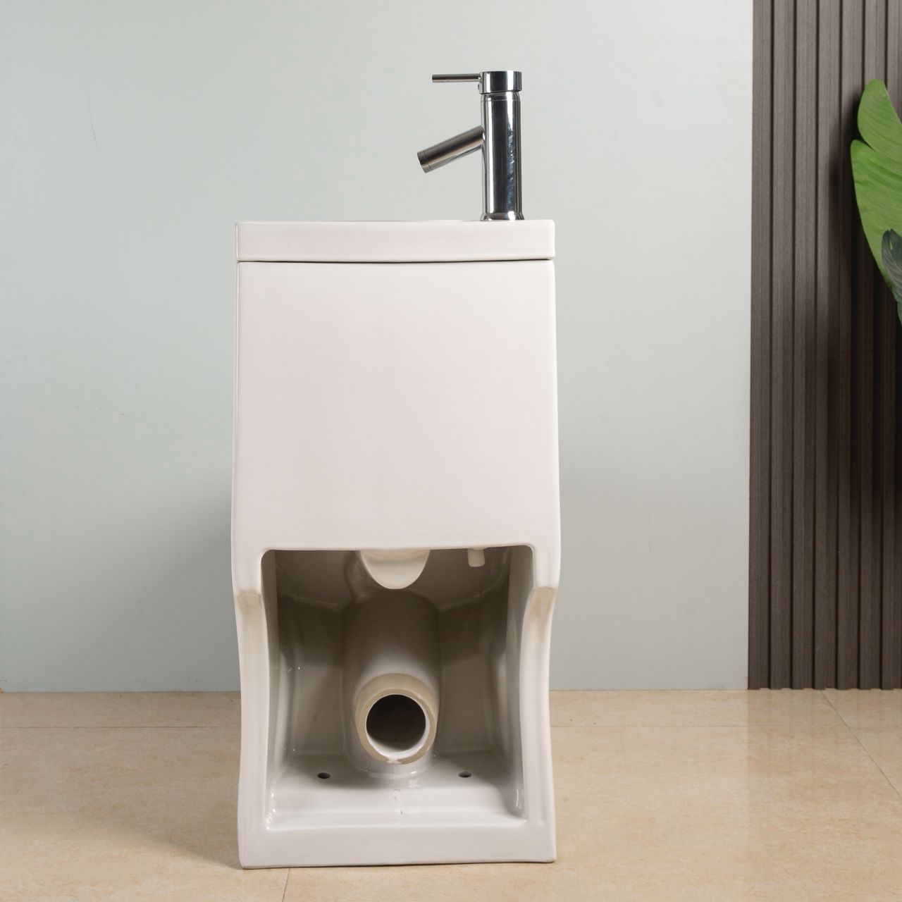 Zawór (bateria) podłączony jest przez zbiornik, który ma dolne napełnianie, z dwoma dopływami wody. -Umywalka z otworem na zawór po lewej stronie (nie można obrócić), bez przelewu -odpływ umywalki odpływ WC dolny / tylny -miska ze zbiornikiem jako jeden element ceramiczny -w tym mechanizm spłukujący, z chromowanym podwójnym przyciskiem do oszczędzania wody (spłukiwanie 3 i 6 l) -zestaw mocujący w komplecie