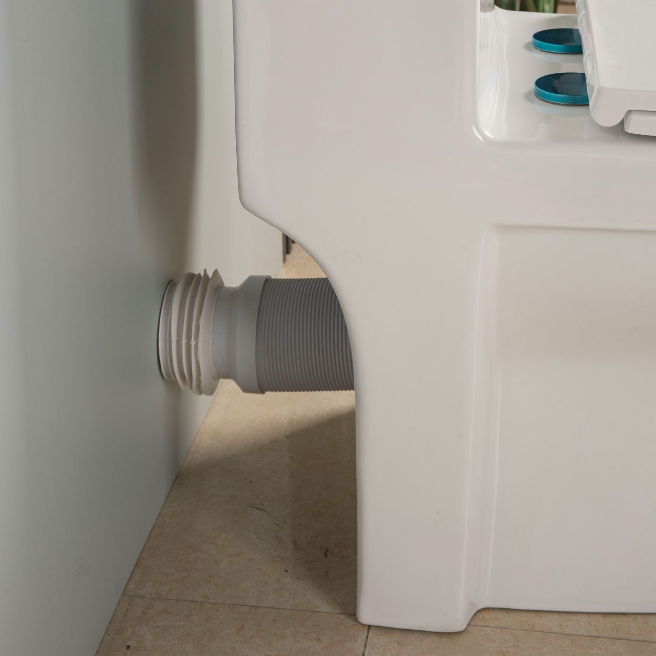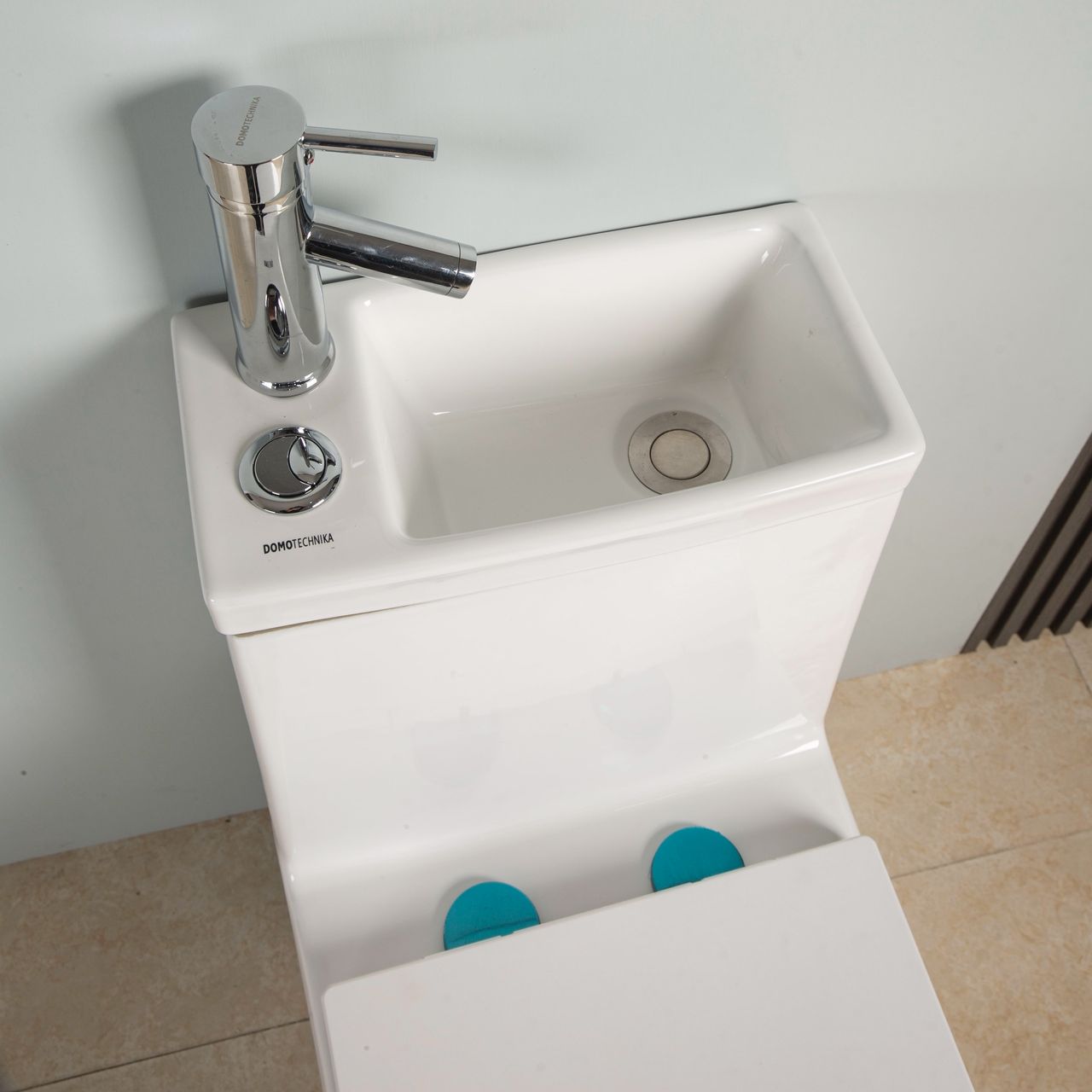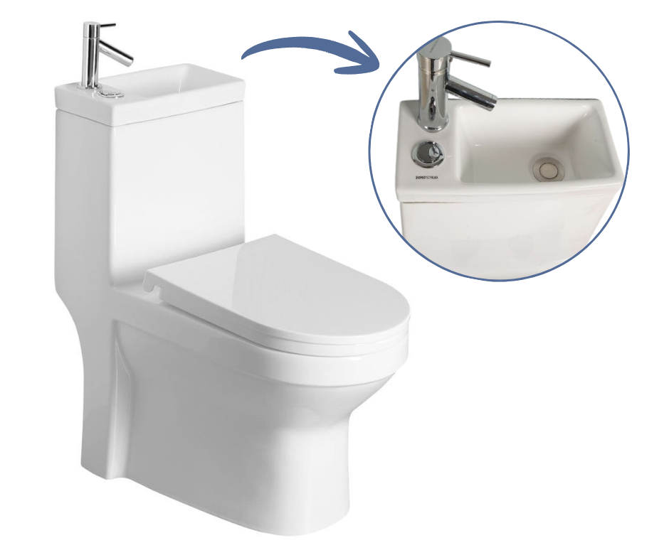 Umywalka zamontowana nad zbiornikiem dodatkowo oszczędza wodę, która podczas mycia rąk spływa do zbiornika aż do momentu, gdy jest pełny. Nadmiar wody następnie spływa do misy.