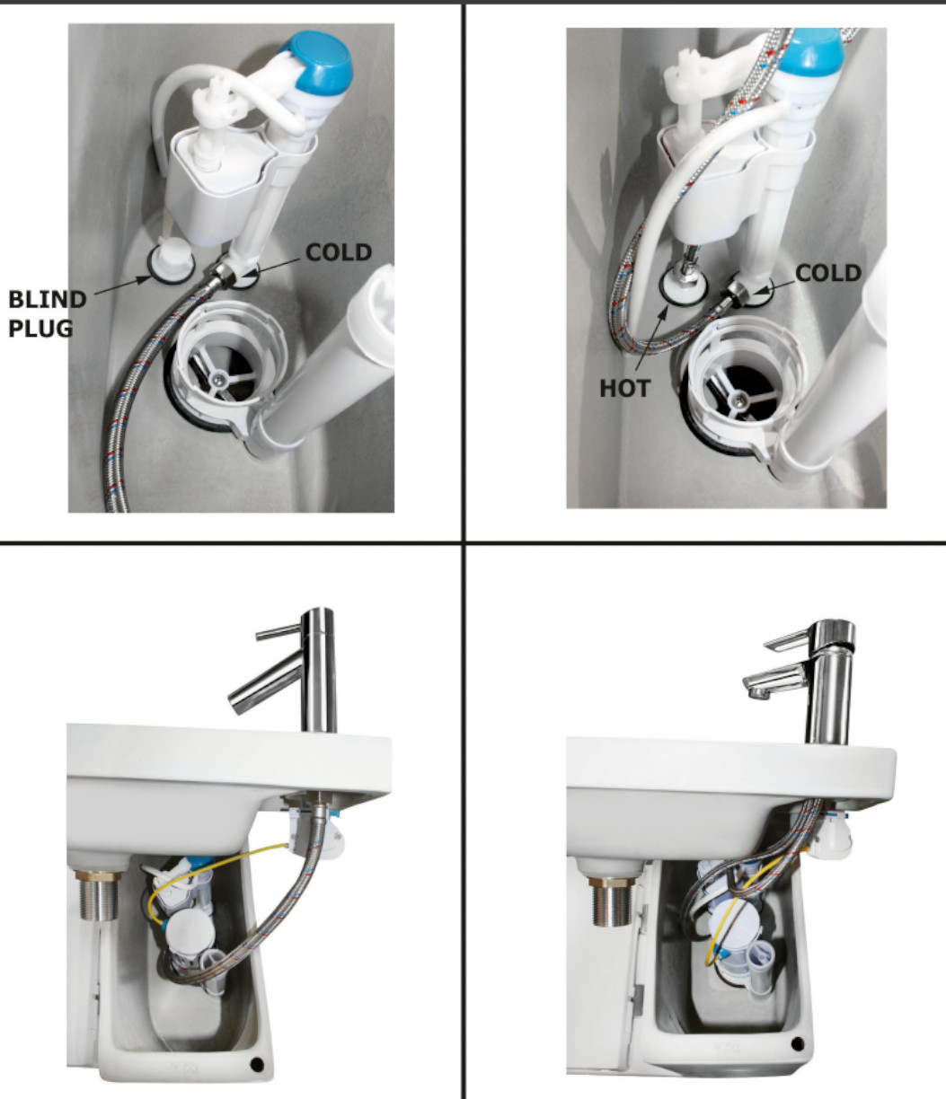 Umieszczenie umywalki na zbiorniku przede wszystkim oszczędza wodę - po umyciu rąk, woda przepływa do zbiornika WC zanim się całkowicie nie napełni.W przypadku, że zbiornik jest już napełniony, woda przepływa wprost do miski WC. Zawór podłącza się przez zbiornik, który ma dolne zasilanie wodą. Woda jest dorowadzana dwoma wlotami. Można podłączyć tylko do zimnej lub zmieszanej wody.