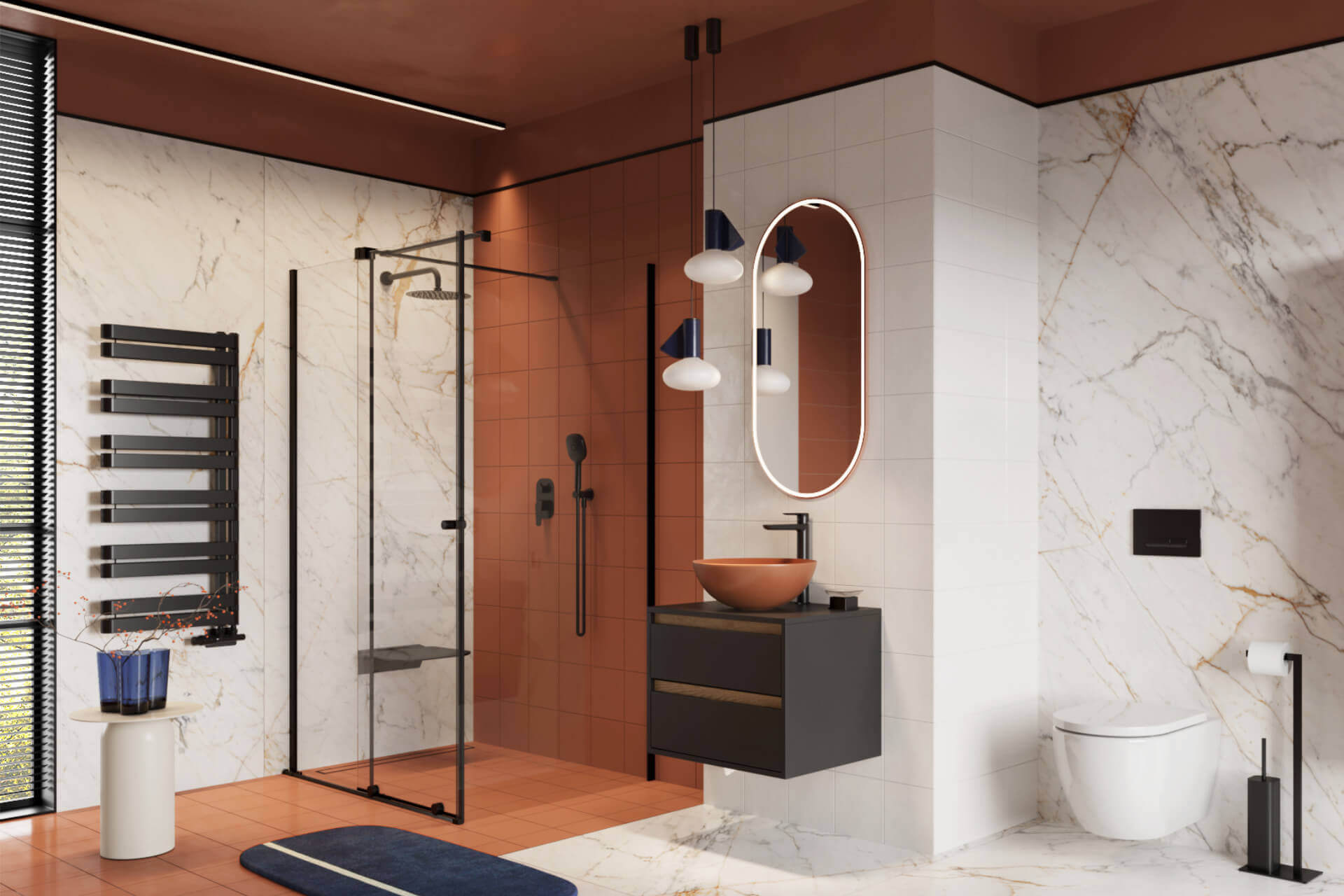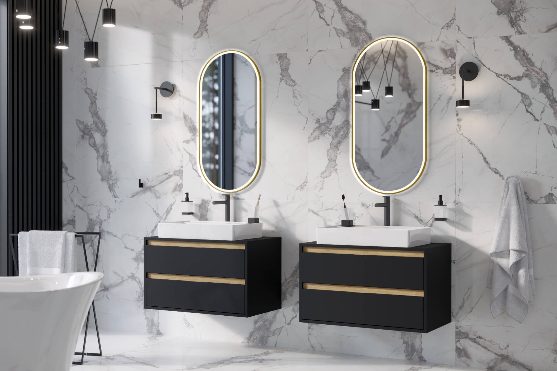 Dostępne są w czterech modnych kolorach ramy: czarny mat, złoty połysk oraz zyskujących na popularności szczotkowanych wersjach kolorystycznych: złotej i miedzianej, które znajdują zastosowanie zarówno w nowoczesnych łazienkach, jak i tych w stylach klasycznym i retro.