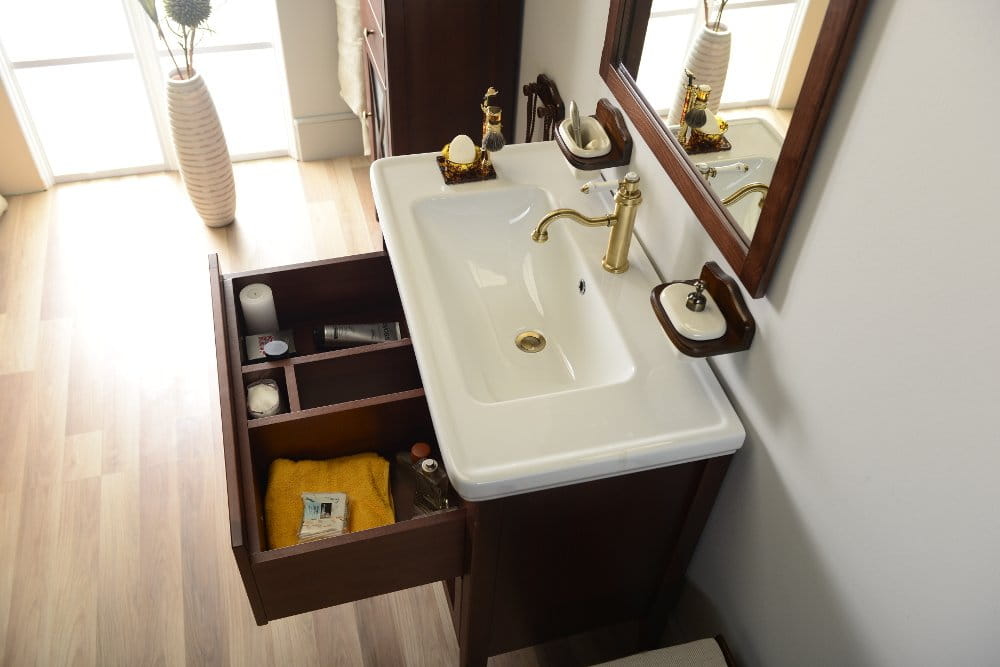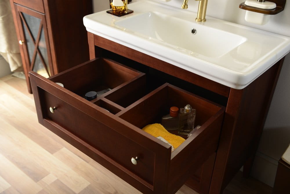 Drewno bukowe o mahoniowym odcieniu doda elegancji Twojej łazience. Szafkę pod umywalkę można uzupełnić całą gamą bocznych szafek i luster w tym samym stylu.