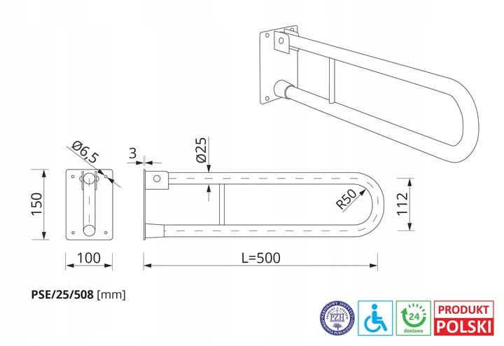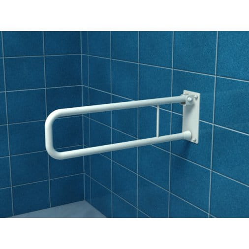 Poręcz dla osób niepełnosprawnych łukowa, uchylna, ścienna długości 500 mm, ogólnego zastosowania, wykonana z rurki ze stali węglowej średnicy 25 mm emaliowanej proszkowo na biało. Poręcz tego typu stosujemy w strefie: umywalkowej, prysznicowej i wc.