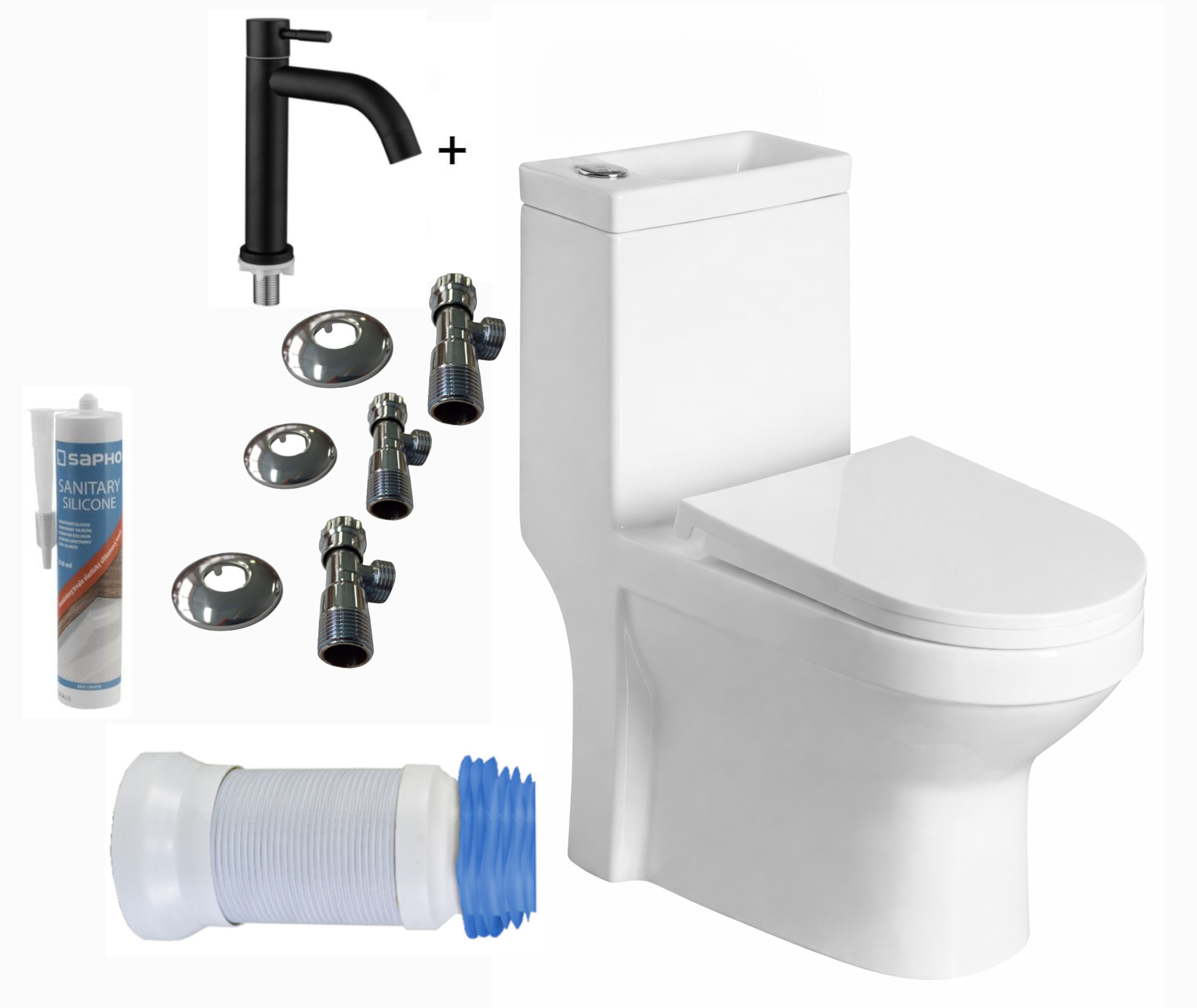 ZESTAW : Kompakt wc z umywalką 36,5x78x72cm i baterią czarna i deską+ odpływ wc + 3 zaworki , biały Alcatraz